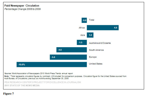 Recent data shows the “death of print” is, if even real, a limited phenomenon (44). Newspaper circulation declined 9.2 percent in North America and 2.9 percent in Europe between 2004 and 2009. By contrast, it increased 16.4 percent in South America, 16.1 percent in Asia and 14.2 percent in Africa during the same period45. Global print newspaper circulation declined 0.8 percent from 2008 to 2009, but overall circulation was 5.7 higher in 2010 than five years earlier46. By the end of 2010, revenues were expected to rise globally, according to data from the Pew Research Center’s Project for Excellence in Journalism.
