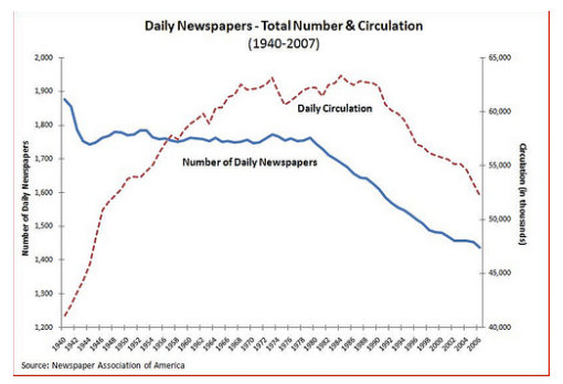 Figure 3 provides a clearer idea of how steep the decline in circulation for American daily newspapers has been in the past decades.