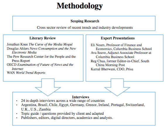 Our conversations rested on two pillars: an in-depth literary review, as well as drawing on the knowledge of experts from the academic and professional realms. Experts included Eli Noam, Professor of Finance and Economics at Columbia Business School, Reg Chua former Editor-in-Chief of the South China Morning Post, Kamal Beherwanti, CDO of the Spanish Media Conglomerate PRISA and Ava Seave, Adjunct Associate Professor at Columbia Business School.