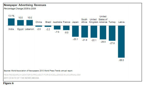 In the United Kingdom circulation fell by 25 percent between 2007-09, second only to the US, where the decline was 30 percent. Greece saw a decline of 20 percent, Italy of 18 percent and Canada of 17 percent (3). Conversely, newspapers in much of the developing world have been experiencing growth; circulation increased by up to 30 percent in Africa, 13 percent in Asia and 4.55 percent in South America. On the African continent, newspapers suffer from a lack of advertising revenue and investment in new technology and personnel (4). However the common aspect to all countries is the speed at which the industry is changing, and the common challenge consequently becomes trying to keep up.