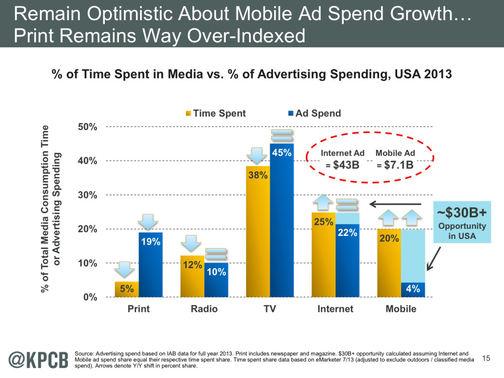 The second chart comes from Kleiner Perkins Caulfield Byers partner and long-time internet analyst Mary Meeker’s latest State of the Internet presentation. It contrasts the amount of time that users spend on a specific form of media — mobile, print, TV etc. — with the share of advertising spending that is devoted to that platform. Last year, print got just 5 percent of the overall time spent on media, but it pulled in almost 20 percent of the overall advertising revenue.