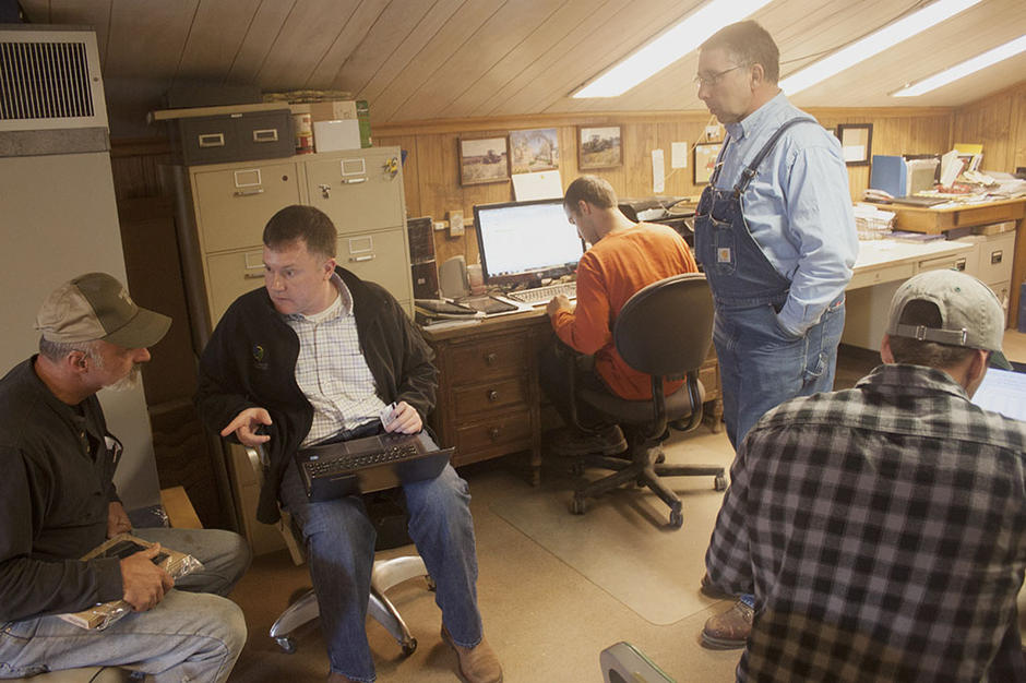 Dusty wooden stairs lead up to the barn office, which overlooks miles of green fields and giant combines parked on gravel drives. It’s a cool April day in Palmyra, Indiana, and there is a high chance of rain. Six men huddle around a table, hunched over computers.