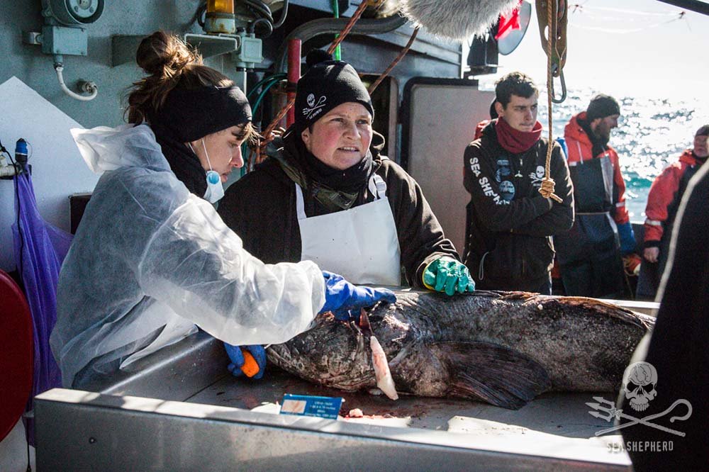 Colette, and fellow Science Officer, Bia, perform a dissection on a toothfish, killed in the illegal gillnets. Photo: Jeff Wirth