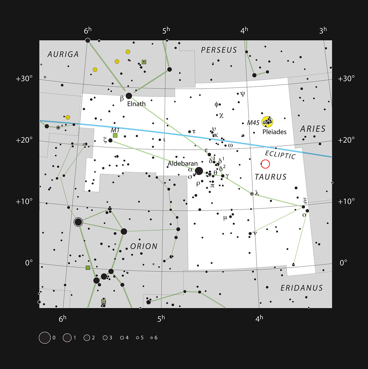 This chart shows the location of the unusual double star V471 Tauri (red circle). All the stars visible with the naked eye on a dark night are indicated. The object itself can be easily seen in a small telescope, but just appears as an unremarkable faint star. V471 Tauri is an outlying member of the bright Hyades star cluster. Source: ESO