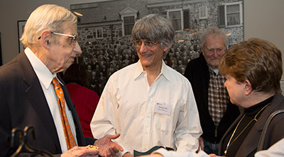 David Gabai (center), the Hughes-Rogers Professor of Mathematics and department chair, said that he feels a “special connection” to Nash from his years as a Princeton graduate student in the 1970s when Nash was a regular feature of the department commons room. At right is Nash’s wife, Alicia.
