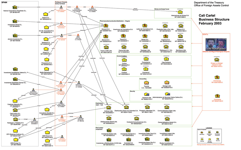 This chart, which outlines the structure and hierarchy of the Cali drug cartel, was generated by the U.S. Department of the Treasury in 2003. Today, Drexel researchers are using social network analysis tools to get a better look at the structure of organized crime in cyberspace.