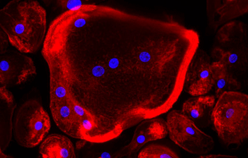Immunofluorescence image of multinucleate osteoclast generated by exposure of pre-osteoclast cells to lysyl oxidase.
