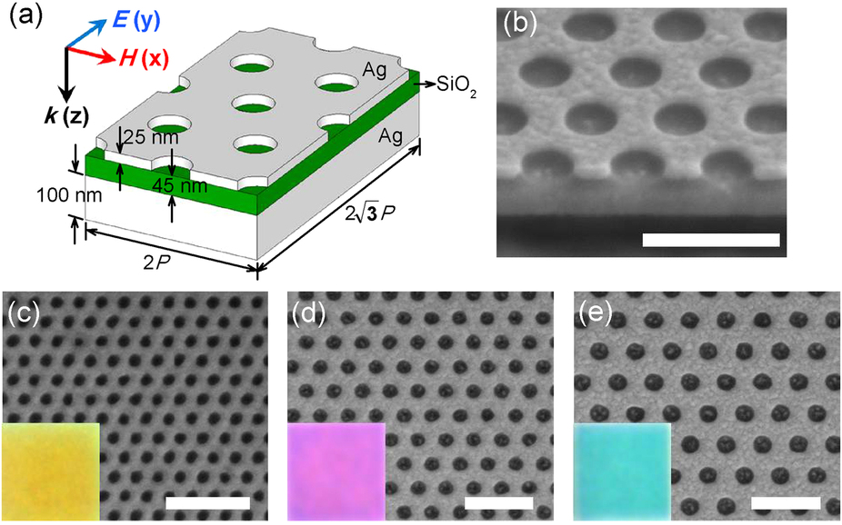 (a) Schematic view of four unit cells for triangular-lattice circular hole arrays fabricated on the silver-silica-silver three layer structure. (b) An example of SEM cross-section image of the metasurface structure with period (P) of 320 nm and hole radius (r) of 100 nm. (c–e) SEM images of three metasurfaces with different lattice geometrical parameters (c: P = 130 nm, r = 35 nm; d: P = 200 nm, r = 50 nm; e: P = 260 nm, r = 65 nm). Insets: Optical reflection microscopy images of the entire 20 × 20 μm2 circular hole arrays of triangular lattice. Scale bars: 500 nm.