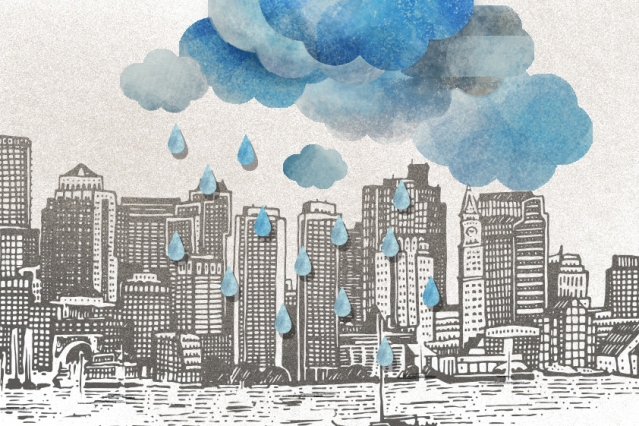 An MIT study explains how rain droplets attract aerosols out of the atmosphere. Illustration: Christine Daniloff/MIT