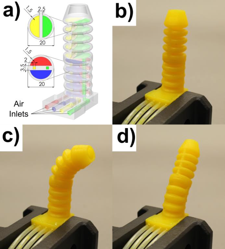 The research team developed the mechanical design using a digital mask projection stereolithgraphy system for the 3D printing of soft actuators. The system is detailed in a recent study published in the journal Bioinspiration & Biomimetics, by Ph.D. student and lead-author Bryan Peele and the team of researchers.