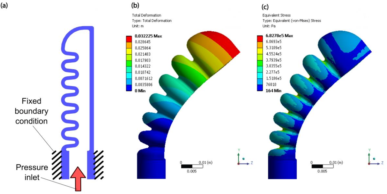 (a) Cross-section of single-channeled actuator with fixed boundary condition imposed on the base and uniform pressure applied to internal surface. (b) deformation of the single- channeled actuator. (c) stress field on the single-channeled actuator.