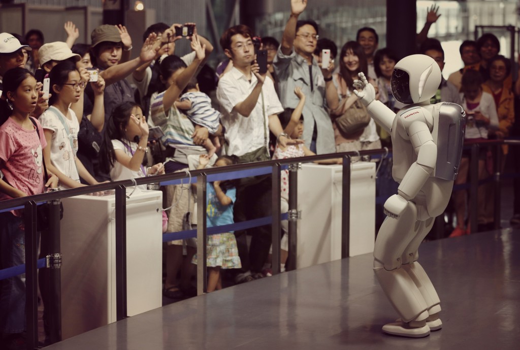 Asimo, built by Honda and the world’s most advanced robot, can run, climb stairs and converse, but it still confuses a hand raised with a question and a hand raised to take a photo. Courtesy of Honda.