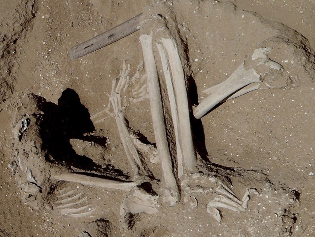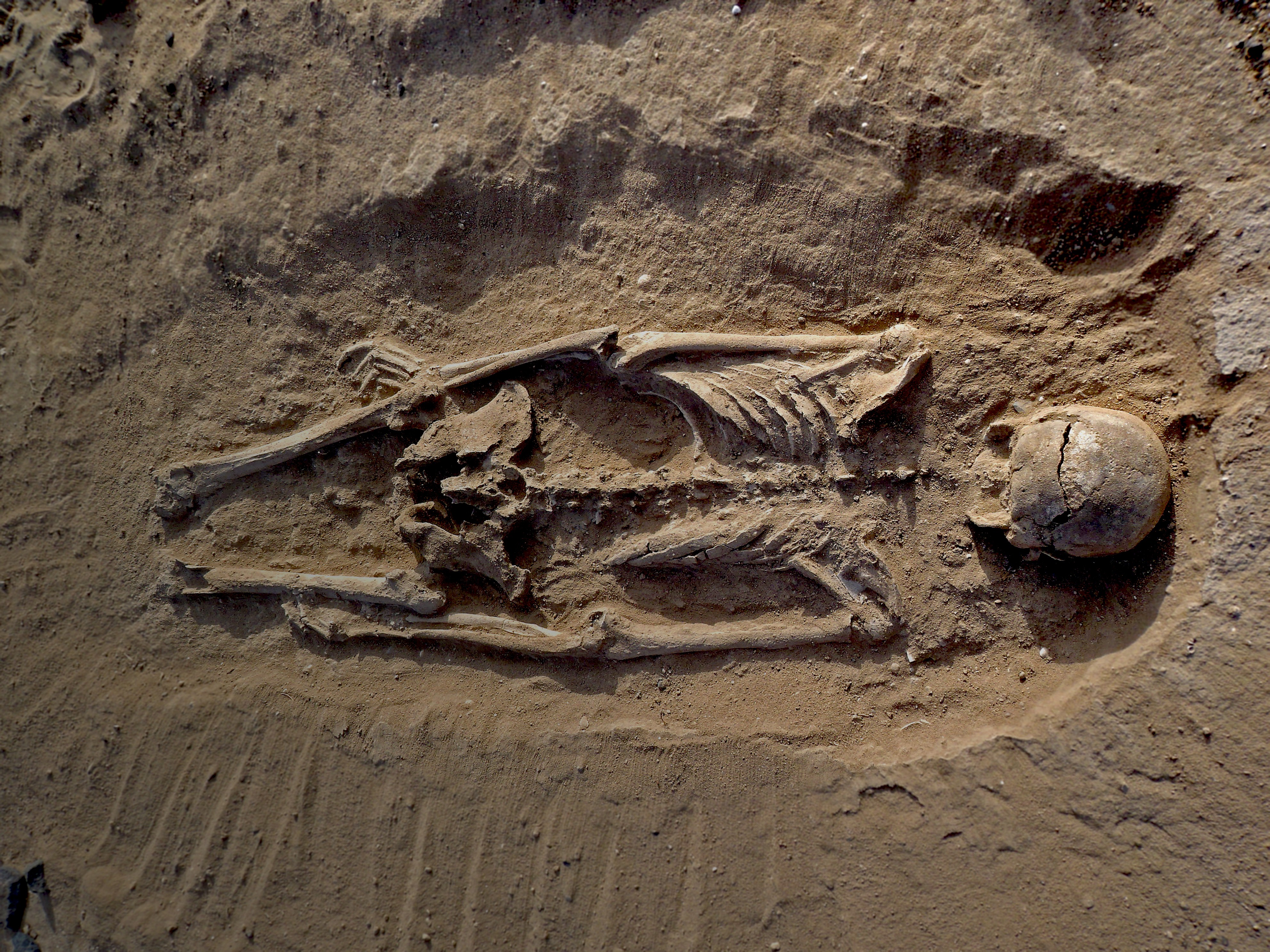 Several of the skeletons were found face down; most had severe cranial fractures. Among the in situ skeletons, at least five showed “sharp-force trauma”, some suggestive of arrow wounds. Four were discovered in a position indicating their hands had probably been bound, including a woman in the last stages of pregnancy. Foetal bones were uncovered.