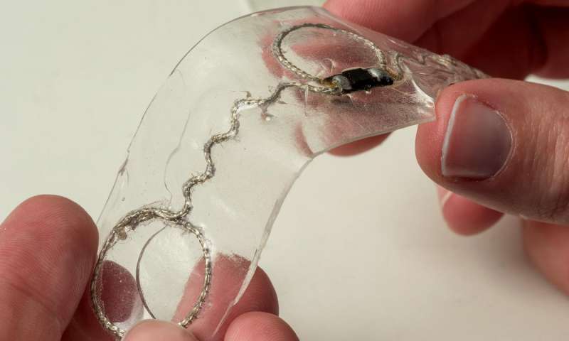Researchers at The Ohio State University are developing embroidered antennas and circuits with 0.1 mm precision — the perfect size to integrate electronic components such as sensors and computer memory devices into clothing. They are also exploring other uses for the technology, including this flexible circuit that contains an RFID chip. Credit: Jo McCulty, courtesy of The Ohio State University