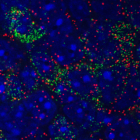 The image shows coexpression of Agrp (green) and the sodium channel Nav1.7 (red) in neurons in the hypothalamus. Credit: Sternson Lab, HHMI/Janelia Research Campus
