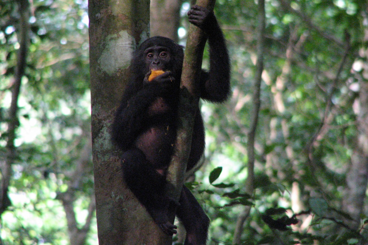 A bonobo, formerly called a pygmy chimpanzee, eating fruit in the Democratic Republic of the Congo. Bonobos, chimps, gorillas and humans have all evolved their own gut microbes based on an ancestral gut flora in our most recent common ancestor. (Alexander Georgiev photo, courtesy of Science)
