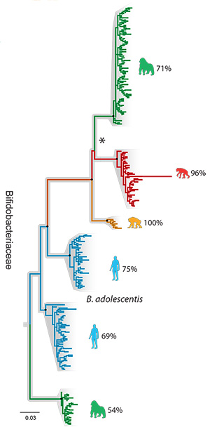 A family tree showing how different strains of Bifidobacteriaceae bacteria evolved in humans (blue) and our hominid relatives, the gorilla (green), chimp (yellow) and bonobo (red).