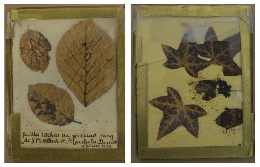 The relic of King Albert I of Belgium bought at an auction by VTM journalist Reinout Goddyn: blood-stained tree leaves collected by people living near the forest at the foot of the rocks of Marche-les-Dames. The DNA analysis has confirmed that the blood really belonged to the monarch. © KU Leuven – Maarten Larmuseau