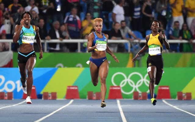Aug 15, 2016: Rio de Janeiro, Brazil; Natasha Hastings (USA) races Shaunae Miller (BAH) and Shericka Jackson (JAM) during the women’s 400m final in the Rio 2016 Summer Olympic Games at Estadio Olimpico Joao Havelange (J. Lang)