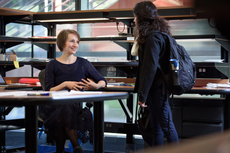 Stanford postdoctoral fellow Tatiana Engel works with a graduate student in the Boahen Lab. (Image credit: L.A. Cicero)