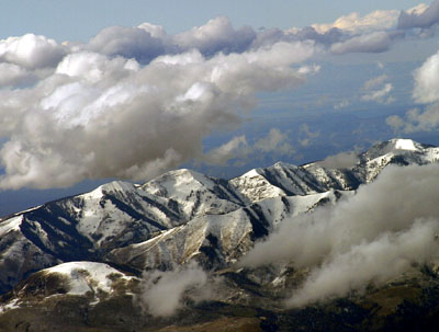 The NSF/NCAR C-130 aircraft passes over a section of the snow-capped Rocky Mountains near Denver on November 1, 2002, while on a flight for the IDEAS (Instrument Development and Education in Airborne Science) project.