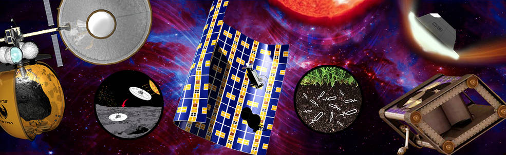 Montage of innovative concepts selected for 2017 NIAC Phase I and Phase II funding. Credits: Joel Sercel, Jay McMahon, Siegfried Janson, Adam Arkin, Jonathan Sauder, John Lewis and background, Chris Mann
