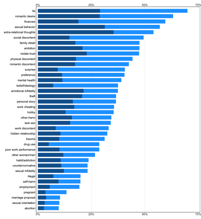The research was co-authored by Professors Slepian and Mason, along with Jinseok Chun, a PhD student at Columbia Business School. Throughout 10 different studies, the researchers analyzed more than 13,000 secrets and discovered the 38 most common secrets kept, which can be seen in the graphic below, along with whether participants in the study admitted to sharing the secret or keeping it private.