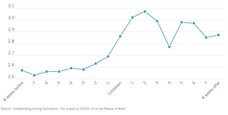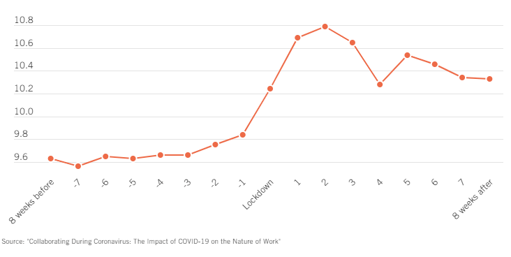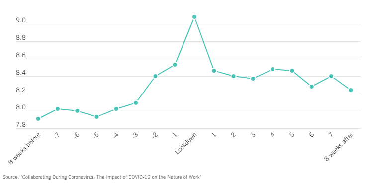 Perhaps most striking: As researchers compared the time when people started sending emails and attending meetings each day and when they ended, they saw that the average workday lasted 8.2 percent longer, an extra 48.5 minutes. While it’s unlikely that employees worked continuously during that period, Sadun suspects that employees adopted more fluid schedules to accommodate interruptions from, say, a child struggling with virtual learning or a sick family member.