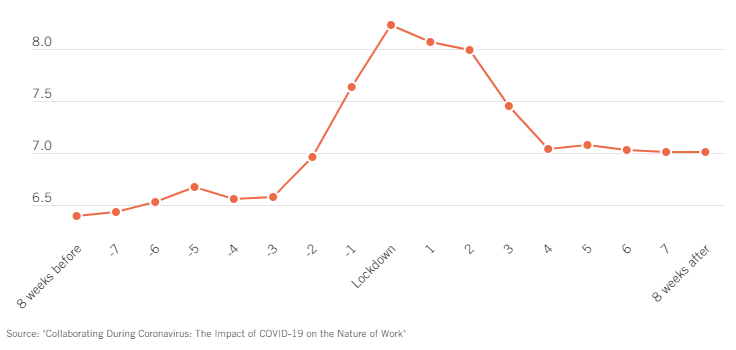 An analysis of the emails and meetings of 3.1 million people in 16 global cities found that the average workday increased by 8.2 percent—or 48.5 minutes—during the pandemic’s early weeks. Employees also participated in more meetings, though for less time than they did before COVID-19 sent many workers home.