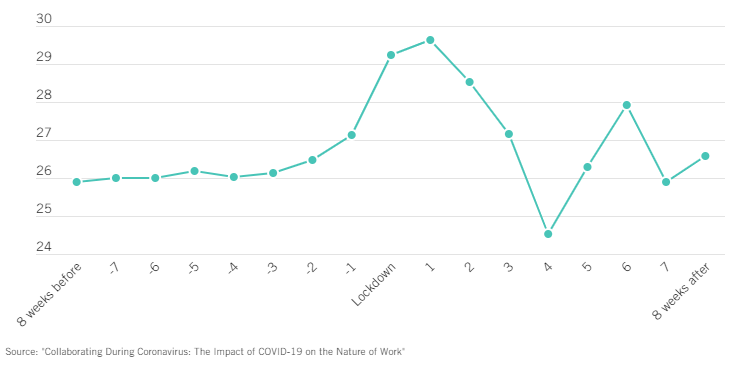 Perhaps most striking: As researchers compared the time when people started sending emails and attending meetings each day and when they ended, they saw that the average workday lasted 8.2 percent longer, an extra 48.5 minutes. While it’s unlikely that employees worked continuously during that period, Sadun suspects that employees adopted more fluid schedules to accommodate interruptions from, say, a child struggling with virtual learning or a sick family member.