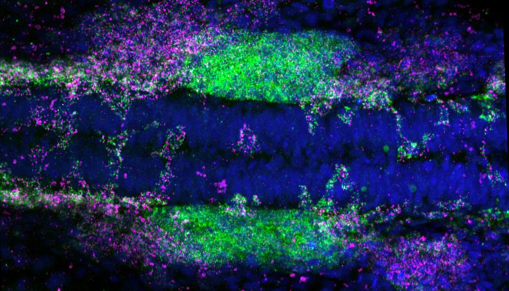 PICTURE on top of page: A 17-hour-old zebrafish embryo labeled with fluorescent tags to indicate key genes expressed in the neural crest, specifically sox10 (green) and ets1 (magenta).